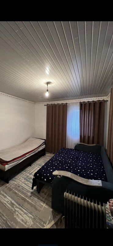 - Просторная спальня/гостиная: два спальных места (кровать и раскладной диван), батарея-обогреватель, плотные шторы блэкаут, потолок из панелей, на полу ковровое покрытие/ковёр.