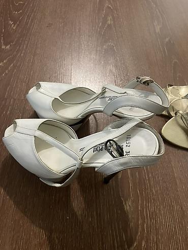 - Белые босоножки на шпильке с небольшой платформой. Открытый мыс «пип-ту», тонкие ремешки, пряжка на щиколотке, внутренняя разметка размера на стельке.