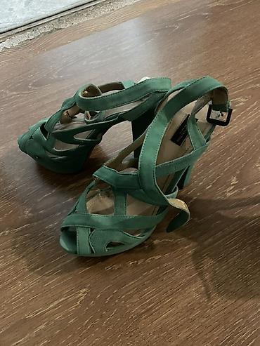 - Зеленые босоножки на высоком устойчивом каблуке и скрытой платформе. Материал — замша/нубук, сложные переплетенные ремешки, открытый мыс, застежка-пряжка на щиколотке.