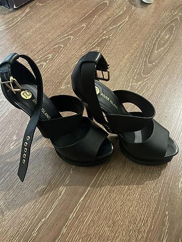 - Черные босоножки River Island. Гладкая кожа/эко-кожа, высокий каблук с платформой, широкий перекрестный ремень, открытый мыс, ремешок на щиколотке с металлической пряжкой и люверсами. Внутри стелька с фирменным логотипом.