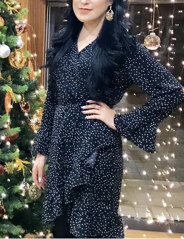 - Черное платье с мелким белым горохом. Запах, V‑вырез, расклешенные рукава, асимметричный подол с мягкими драпировками. Идеально для вечерних выходов — элегантный, женственный силуэт.