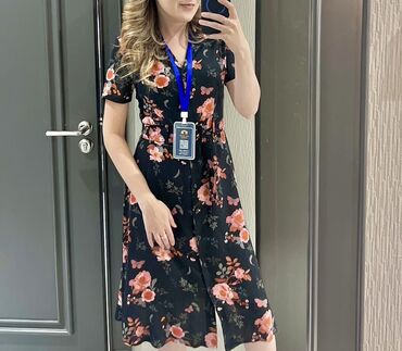 - Платье миди на пуговицах с цветочным принтом на темном фоне. Короткий рукав, V‑вырез, пояс в тон для акцентирования талии, разрез по планке. Легкий дышащий материал, комфортная посадка.