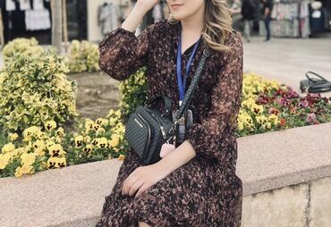 - Платье миди с мелким абстрактным принтом в коричнево-черной гамме. Полупрозрачные длинные рукава на резинке, легкая воздушная ткань, свободный силуэт, V‑образный вырез. Универсально для прогулок и офиса.