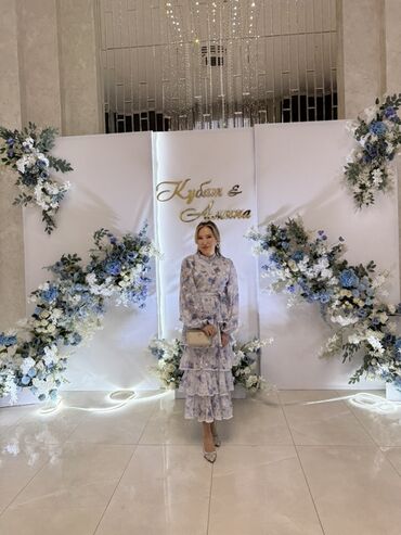 - Платье миди с ярусами и поясом, цветочный принт в светло‑голубой палитре. Длинные рукава на манжетах, закрытый верх, пышные воланы по юбке. Нарядная модель для мероприятий и фотосессий.