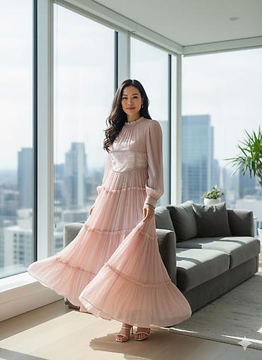 - Воздушная многослойная юбка с мягкими плиссированными ярусами по всей длине, создающими легкое движение.