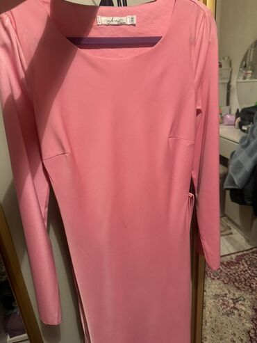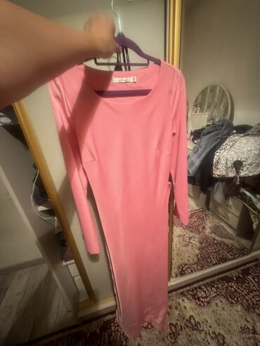 Трикотажное платье миди в рубчик. - Цвет: теплый беж/кэмел. - Фасон: приталенный силуэт, длина ниже колена, короткий рукав-реглан. - Горловина: высокая полустойка. - Трикотаж эластичный, мягкий, х...