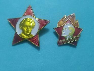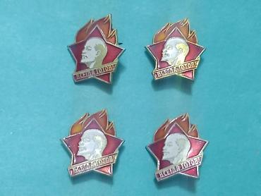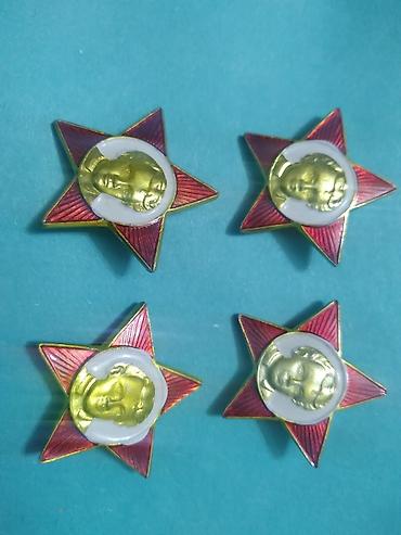 - Октябрёнок — красная пятиконечная звезда с золотистым портретом ребёнка в белом круге. Крепление булавочное. Подойдёт для коллекции советской символики, реконструкций и тематического декора. Цена: 35 сом за штуку.