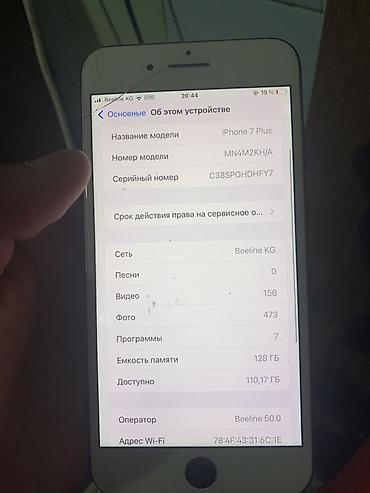 IPhone 7 Plus, модель MN4M2KH/A. Цвет – черный. Память 128 ГБ, доступно около 110 ГБ. Дисплей 5.5", кнопка Touch ID. Двойная основная камера с портретным режимом и оптическим зумом, вспышка True Tone; фронтальная камера FaceTime HD. Стереодинамики, микрофон, разъем Lightning. Поддержка 4G/LTE, Wi‑Fi, Bluetooth, GPS/ГЛОНАСС, NFC для Apple Pay. На скриншотах указаны: оператор Beeline KG, версия настроек «Об этом устройстве», серийный номер C38SPGHDHFY7. На экране видна защитная пленка/стекло. Компактный корпус из алюминия, цвет Black, логотип Apple. Отлично подходит для фото и видео (снято 156 видео и 473 фото), повседневных задач и приложений.