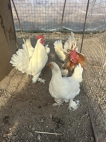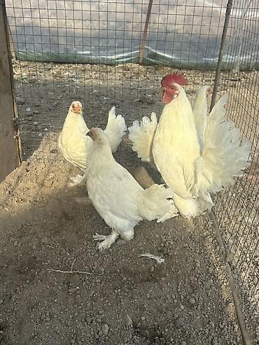 Порода: декоративные карликовые куры (бентамки) с оперёнными лапами, белого окраса.
