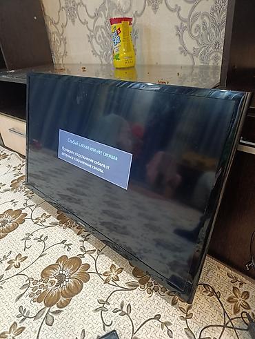 LED телевизор, диагональ около 32–40". Плоская панель, тонкая рамка по периметру. На экране выводится системное уведомление «Слабый сигнал или нет сигнала», что подтверждает работу матрицы и подсветки. Интерфейсы: видны разъёмы на задней панели (кабель антенны подключается), есть питание от сети. Управление — с помощью пульта ДУ (на фото пульт рядом). Идеален как экран для приставок, медиаплеера, ТВ‑приставки или в качестве дополнительного монитора через совместимые входы.