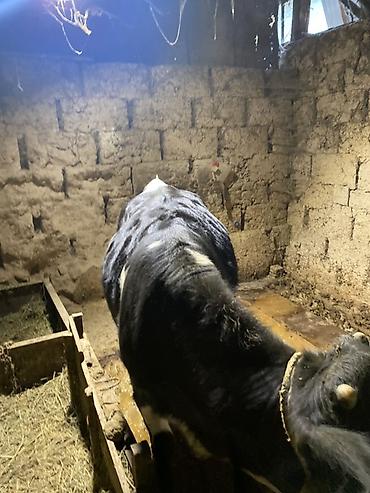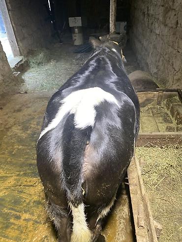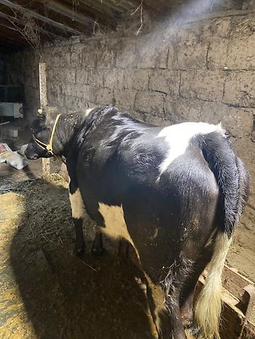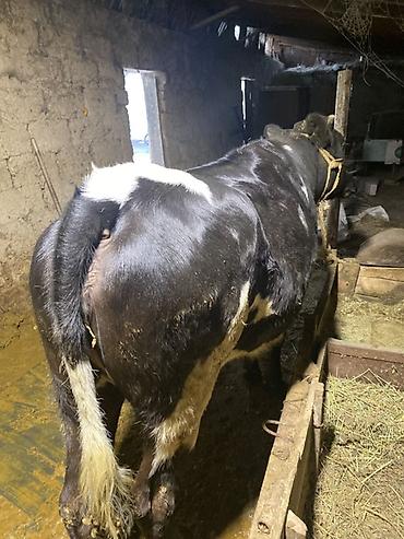 Бык/тёлок молочно-мясного направления, масть чёрно-белая (тип холмогор/черно-пёстрый). Крупное животное с хорошо развитыми задними и поясничными мышцами, широким крестцом и плотным корпусом. Ровная линия спины, крепкий костяк, правильная постановка конечностей. На шее — верёвочный недоуздок.