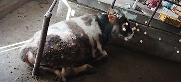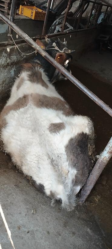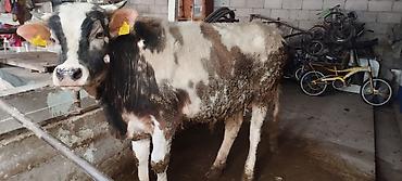 Бык-подросток, черно-пестрой масти (пятнистый), с бирками идентификации в ушах. На фото — содержится в стойле, привязан верёвкой за рога. Корпус широкий, крепкие конечности, развитая мускулатура. Голова с белым лбом и темной «маской», широкая грудь, ровная спина. Шерсть густая, зимняя, окраска пестрая: белые, серые и темно-коричневые пятна по корпусу и шее. Рога короткие, прямые. Носовое зеркало пигментированное, копыта темные. Подходит для откорма на мясо или разведения. На фото показан в коровнике у кормушки.