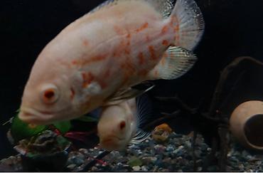 Астранотусы (оскары) альбино, декоративные цихлиды для крупного аквариума. Описание: - Окрас: светлый (альбино) с оранжевыми пятнами, яркие глаза. - Размер на фото: средний/крупный, тело массивное...
