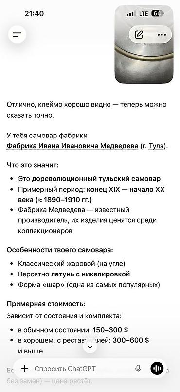 Подойдёт для коллекции дореволюционных тульских самоваров, интерьера в русском стиле или для атмосферного чаепития на углях. Оригинальная аутентичная фурнитура и конструкция.