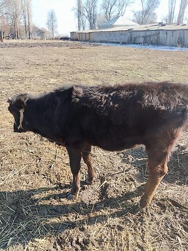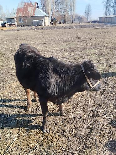 - Молодой телёнок с густой зимней шерстью, масть темно-бурая/чёрная, с белой головой и концом хвоста.