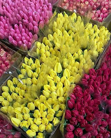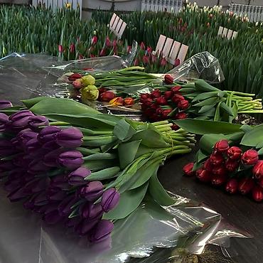 Свежесрезанные тюльпаны - Разнообразие оттенков: жёлтые, розовые, красные, сиреневые, двухцветные. - Продаются поштучно и готовыми букетами. - Индивидуальная сборка на месте: классические моно-бук...