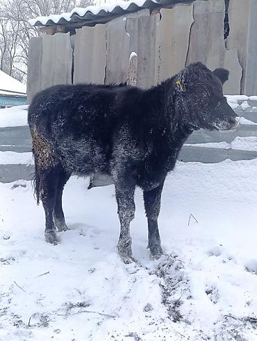 Бычок (молодняк КРС), окрас черный с белой отметиной на лбу. Уши с бирками, на фото в недоуздке. Крепкая конституция, ровная спина, широкая грудь и зад, хорошо развитые мышцы. Прямые крепкие конечн...