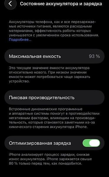 - Аккумулятор: максимальная ёмкость 93% (скриншот состояния аккумулятора на фото), включена «Оптимизированная зарядка»