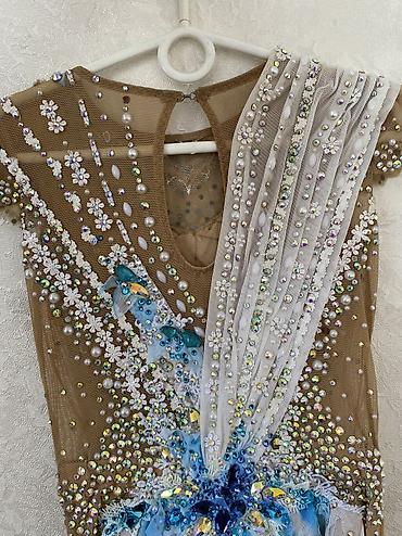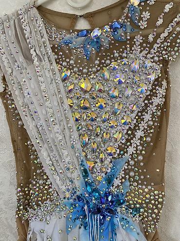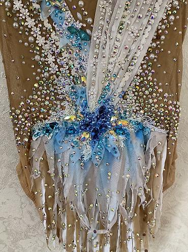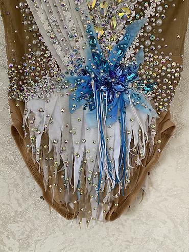 Продаётся очень красивый профессиональный купальник для художественной гимнастики. Нюдовая основа с роскошной расшивкой: крупные и мелкие стразы, камни, жемчуг, 3D-декор и нежные голубые элементы. На ковре смотрится дорого и эффектно, сильно блестит при свете.