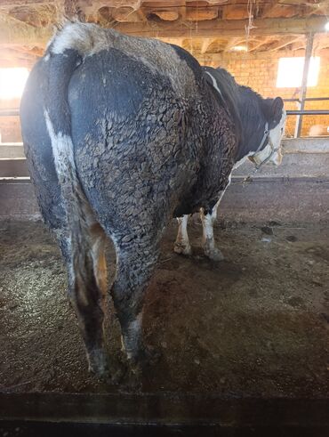Бык-производитель, чёрно-пёстрый окрас. Крупный, сильный, с широкой грудью и хорошо развитыми мышцами. Содержится в крытом загоне, на привязи, с кормушкой для сена. На фото — реальное животное, спо...