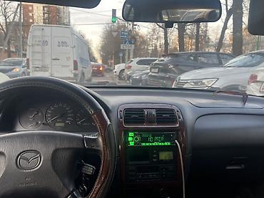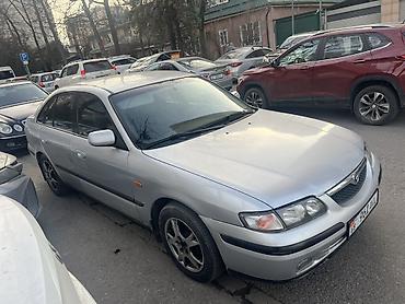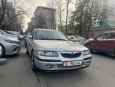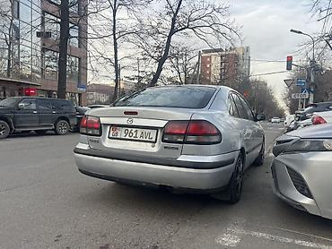 Mazda 626 седан, белый цвет, киргизские номера KG 09. Кузов 4‑дверный, классический дизайн 90‑х. Передние и задние бамперы с интегрированными противотуманными нишами, узкая оптика спереди, горизонт...