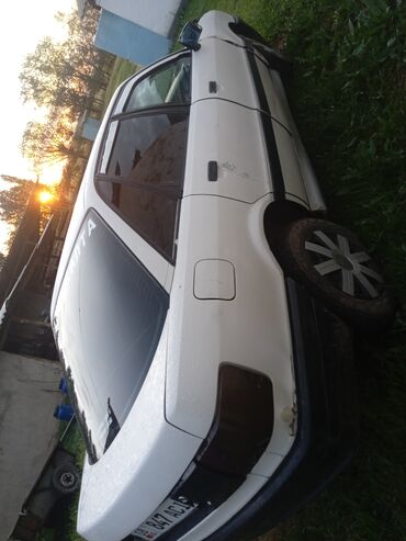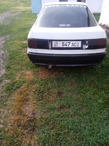 Audi 80 B3 седан, белый цвет. На фото – автомобиль с киргизскими номерами (KG, регион 07). Основные особенности по снимкам: - Кузов: 4 двери, задний спойлер, тонированные задние стекла. - Оптик...