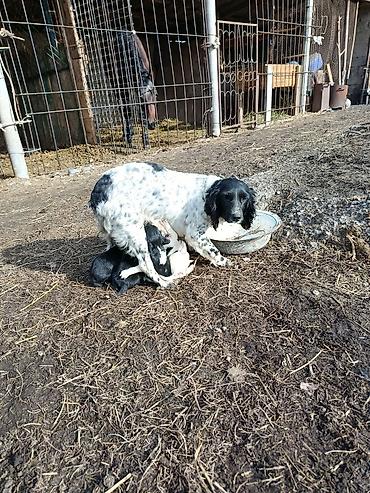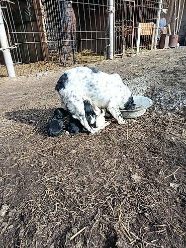 Щенки от черно-белой суки (пятнистый окрас). Малыши на естественном вскармливании, рядом с мамой. В помете есть щенки черного и черно-белого окраса. Уши длинные, шерсть гладкая, густая, с контрастными пятнами. Активные, плотно сбитые, с широкими лапками.