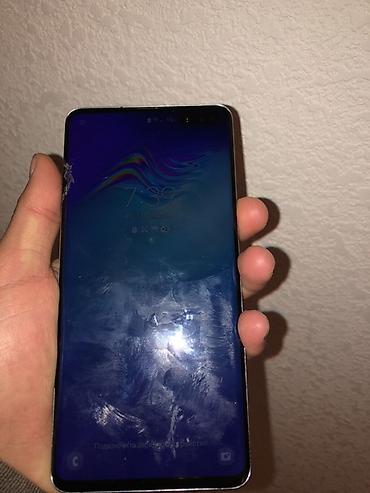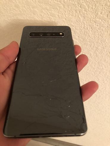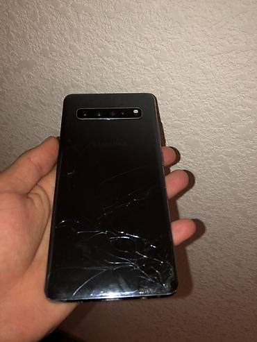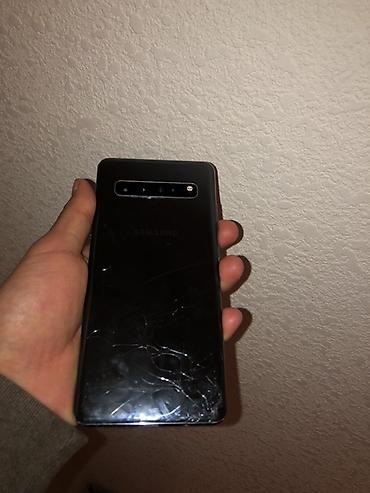 Смартфон Samsung Galaxy S10 5G (модель с тройной основной камерой и горизонтальным блоком камер). Корпус в чёрном цвете.