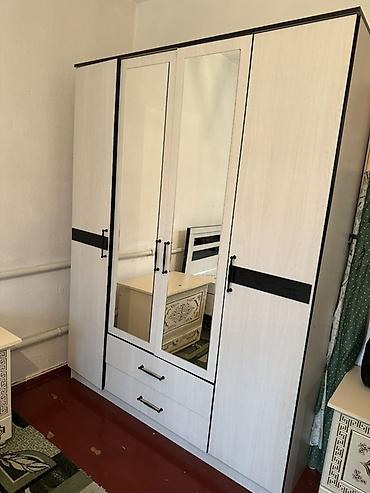 - Шкаф 4-дверный: две центральные двери с зеркалами, нижние два выдвижных ящика, боковые секции с горизонтальными декоративными планками. Удобные ручки, продуманные отделения для одежды.