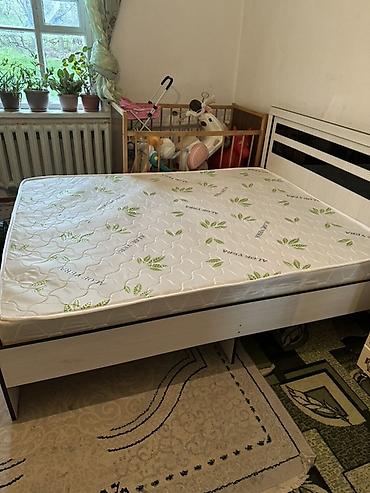 - Кровать двуспальная: прямое изголовье с декоративными вставками, ламельное основание. На фото — матрас стандартной высоты.