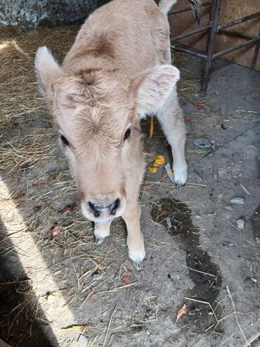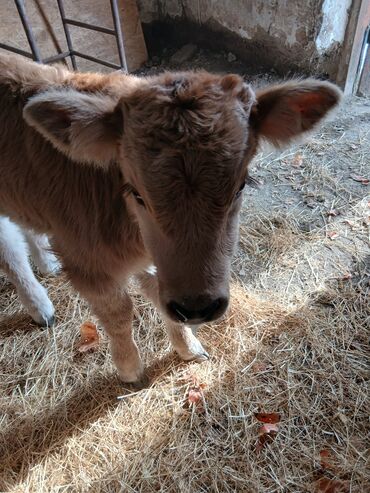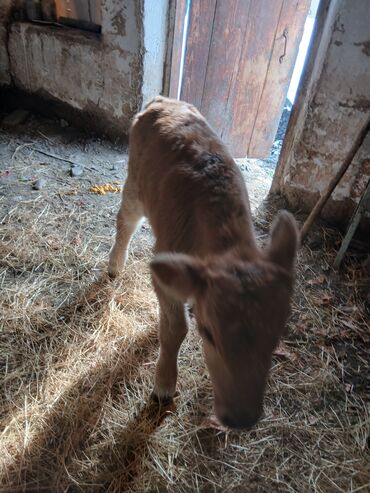 Теленок, рыже-палевый окрас, пушистая шерсть. Судя по фото, возраст совсем небольшой (молочный период). Активный, на крепких ногах. Уши и хвост темнее по краям, морда светлее, нос черный с светлой каймой. Содержится в отдельном стойле на соломенной подстилке.