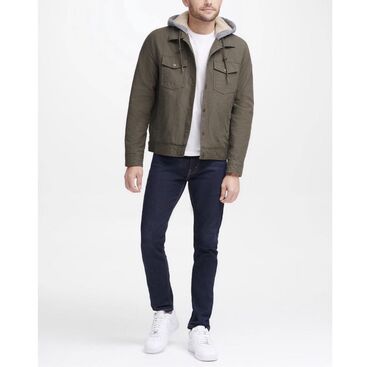 Капюшон на подкладке из искусственной овчины согревает хлопчатобумажную брезентовую модель с застежкой-молнией спереди и множеством карманов.
