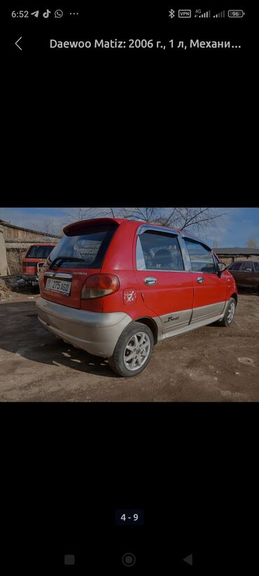 Daewoo Matiz, 2006 г. выпуска. Компактный городской хэтчбек ярко‑красного цвета с серебристыми накладками по низу кузова (версийный обвес Best). 5 дверей, 5 мест. Механическая коробка передач. Бензиновый двигатель 1.0 л.