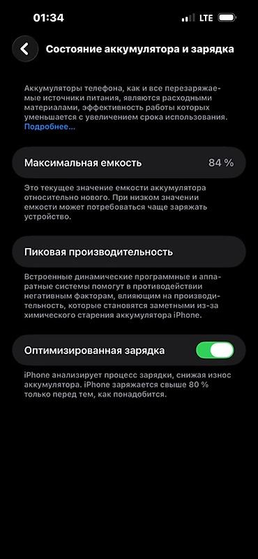 - Аккумулятор: максимальная ёмкость 84% (скриншот из раздела «Состояние аккумулятора и зарядка» прилагается), оптимизированная зарядка включена