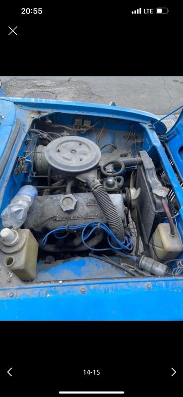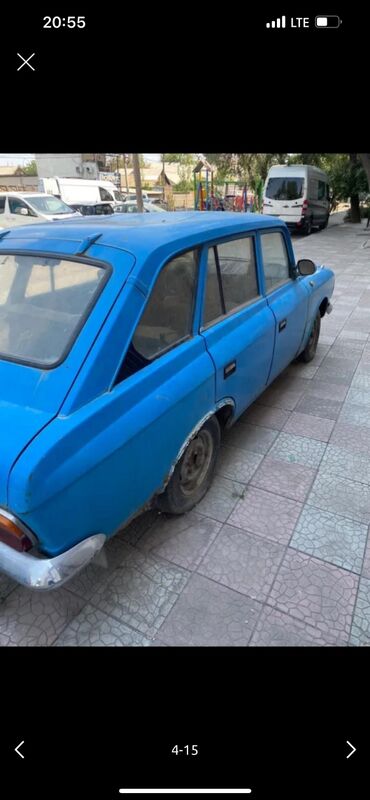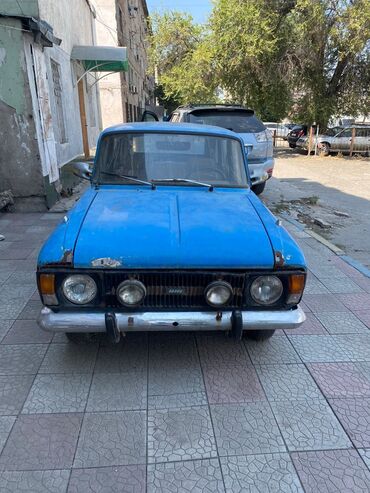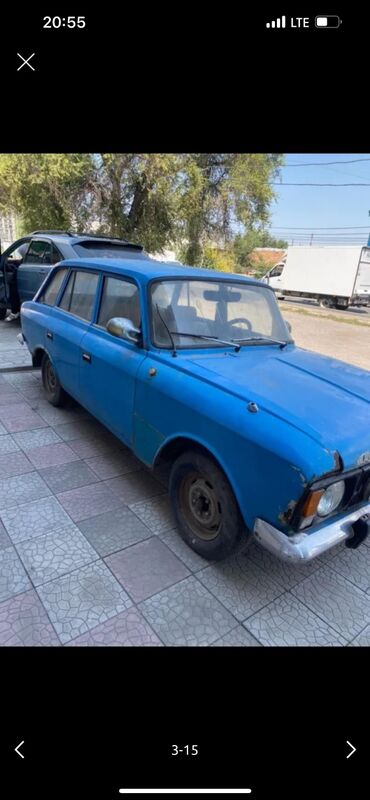 Москвич АЗЛК ярко-салатового цвета, оснащенный багажником на крыше. Этот седан имеет характерный дизайн передней части с прямоугольными фарами, хромированными бамперами и решеткой радиатора. Автомо...