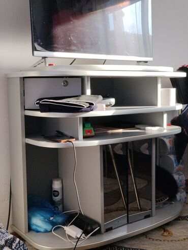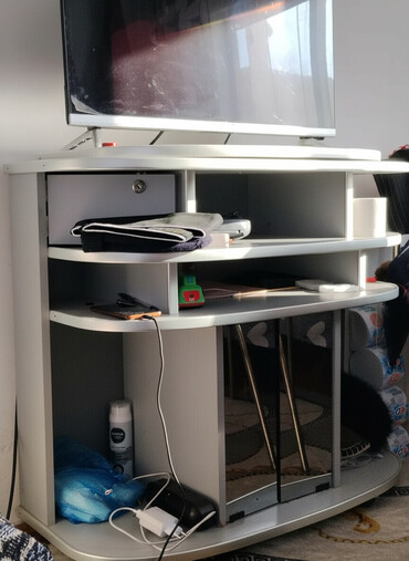 Тумба под ТВ/медиатумба современного дизайна. - Конфигурация: длинная прямоугольная тумба на высоких турецких конических ножках. - Корпус: светлый фасад с горизонтальной фрезеровкой/рифлением, бок...