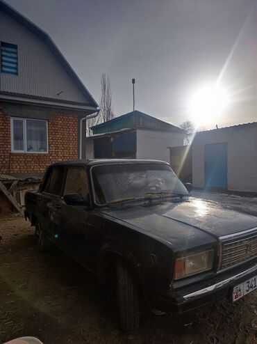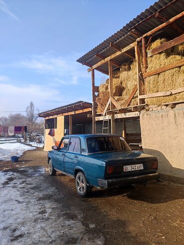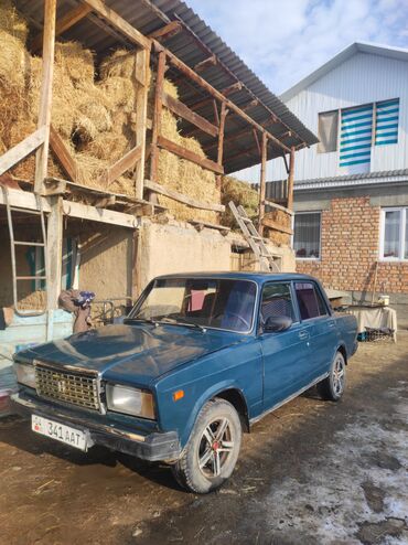 ВАЗ 2107, седан, синие кузовные панели, классическая «решётка» радиатора и прямоугольные фары. Четыре двери, салон на пятерых, багажник объёмный. Задний привод, бензиновый двигатель, механическая коробка передач. Литые диски с низкопрофильной резиной, тонировка задних стёкол. Бамперы и молдинги чёрные, хромированная окантовка решётки и зеркал. На машине установлены киргизские номера “04 KG 341 ААТ”.