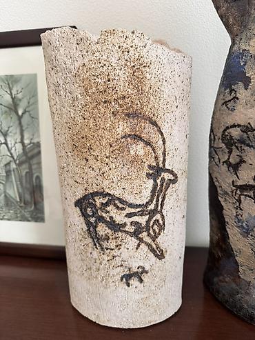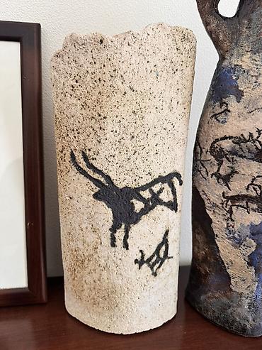 Декоративная керамическая ваза-цилиндр с фактурой «сырого камня» и рисунками в стиле пещерной живописи.