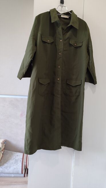 Платье свободного кроя, оливково‑зеленого цвета. - Материал: легкая ткань на основе хлопка (по тактильным ощущениям — натуральная, дышащая). - Силуэт: oversize/А‑образный, длина миди. - Верх: небо...