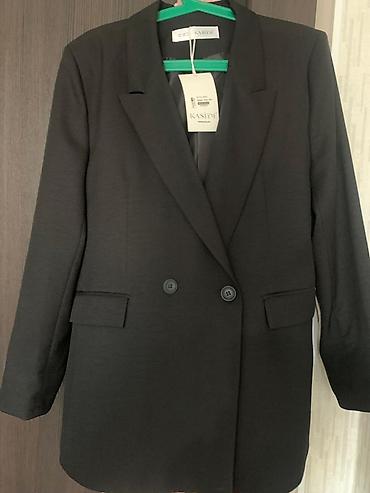 Женский пиджак в полоску - Цвет: черный с тонкой светлой вертикальной полосой - Крой: прямой, удлиненный силуэт - Застежка: одна пуговица спереди - Воротник: классические лацканы средней ширины - ...