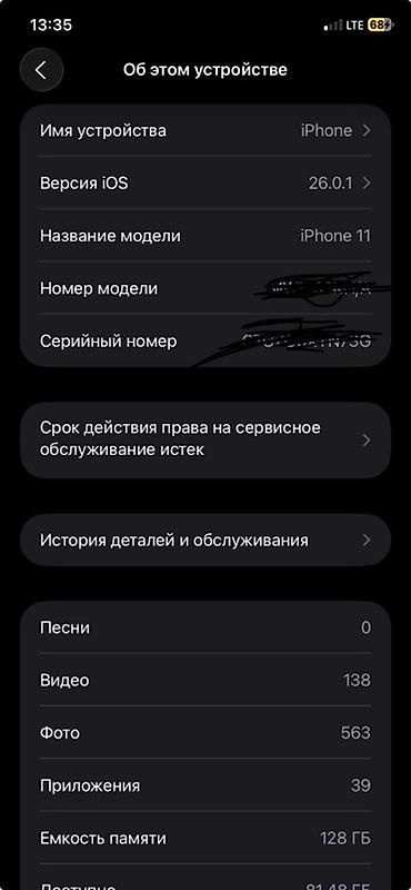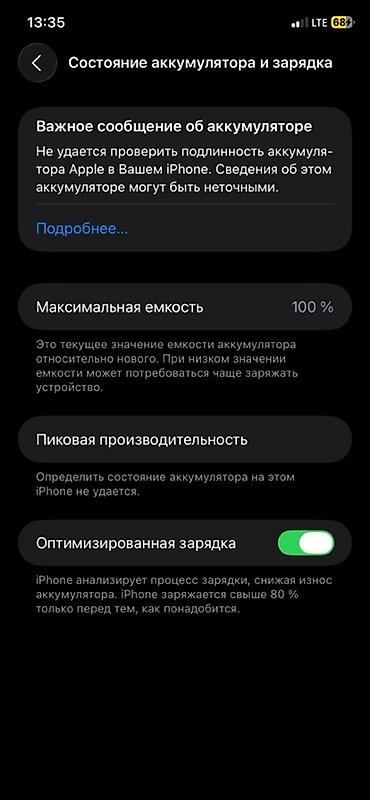 - Аккумулятор: в настройках отображается «Максимальная ёмкость 100%», присутствует уведомление о невозможности подтвердить подлинность аккумулятора; включена «Оптимизированная зарядка».
