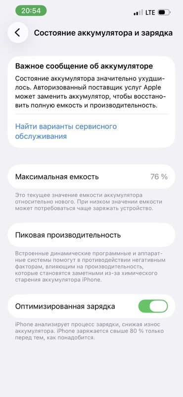 - Батарея: максимальная ёмкость 76%; в разделе “Состояние аккумулятора и зарядка” отображается важное сообщение о необходимости обслуживания аккумулятора. Функция “Оптимизированная зарядка” включена.