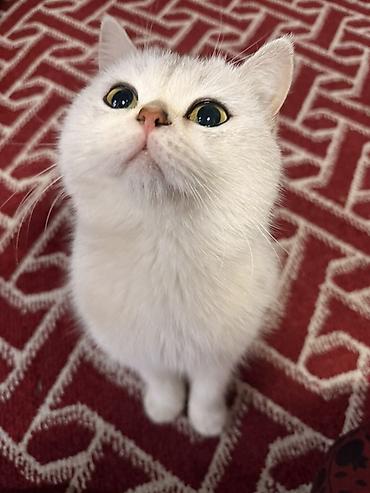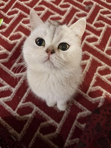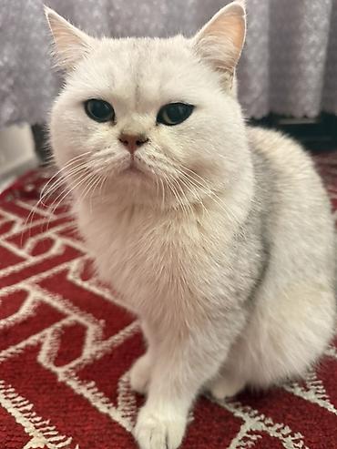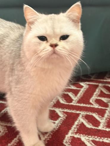 Британская шиншилла (окрас серебристый с затушёванным типпингом). Короткая плюшевая шерсть с плотным подшёрстком, компактное телосложение, широкие щёки и выразительные круглые глаза. Носик розовый, мочка аккуратная, уши небольшие, посажены широко.