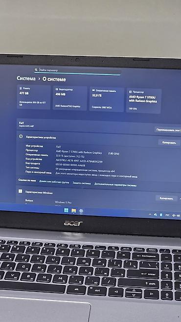 Ноутбук Acer с процессором AMD Ryzen 7 5700U и графикой Radeon Graphics. Оснащен 32 ГБ оперативной памяти и 477 ГБ накопителя, что обеспечивает высокую производительность для различных задач. Работает под управлением операционной системы Windows 11 Pro. Экран с разрешением Full HD (1080p) обеспечивает четкое и яркое изображение.
