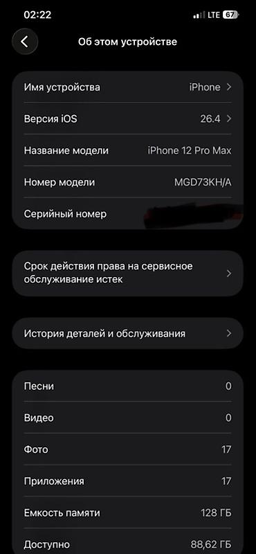 IPhone 12 Pro Max, 128 ГБ Характеристики: - Модель: iPhone 12 Pro Max (номер модели NG9E3LL/A) - Память: 128 ГБ, свободно около 62,83 ГБ - iOS: версия 26.3.1 (согласно скриншоту «Об этом устройств...