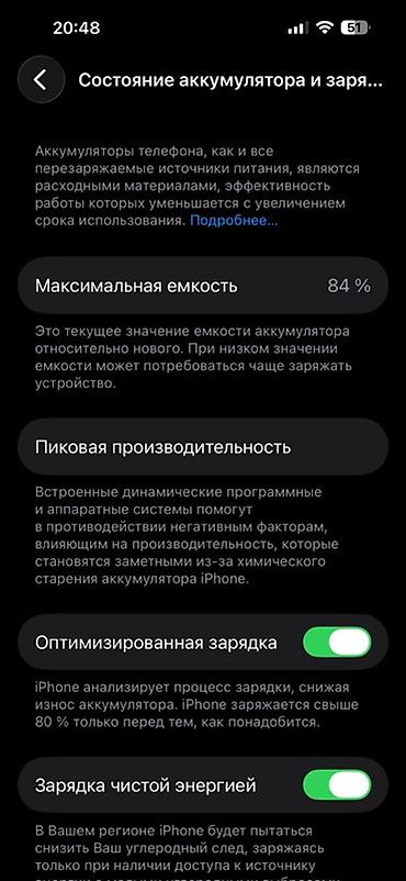- Максимальная емкость 84% (скрин в галерее)