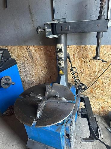 - Шиномонтажный станок полуавтоматического типа с поворотным столом и пневмозажимами для фиксации диска. Монтажная лапа, педальный привод, стойка с регулировкой прижима.