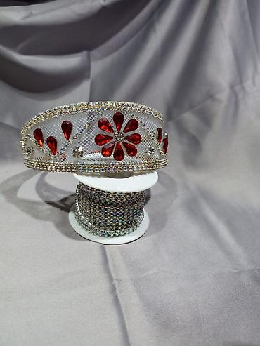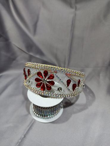 1) Серебристая диадема с сетчатой вставкой, отделкой стразовой цепью по краю и красными кристаллами в виде цветка и капель; акцентные прозрачные камни по периметру.