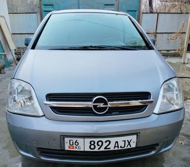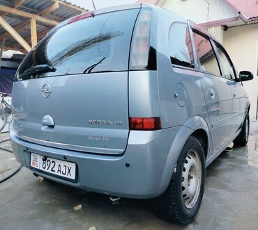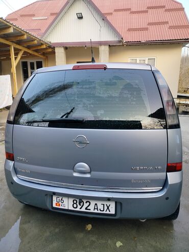 Opel Meriva, 2008 г., бензин 1.6, МКПП. Компактвэн серого цвета с 5 дверями и высоким посадочным местом. Киргизская регистрация (номер 06 KG 892 AJX). Эмблемы и шильдики Meriva 1.6, Opel, Genser-NN.