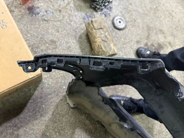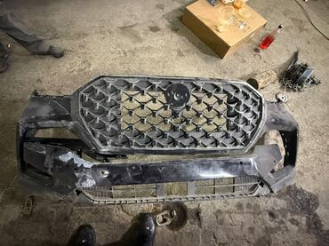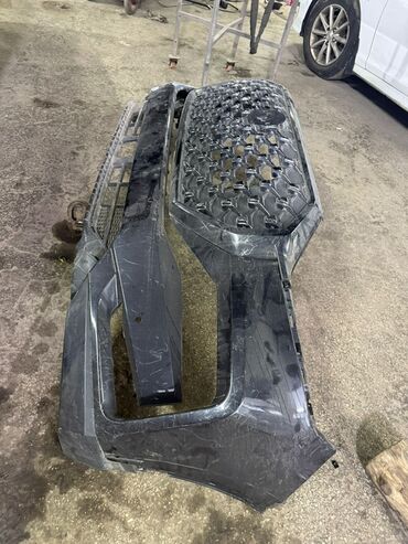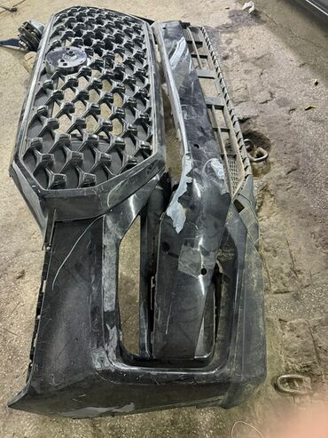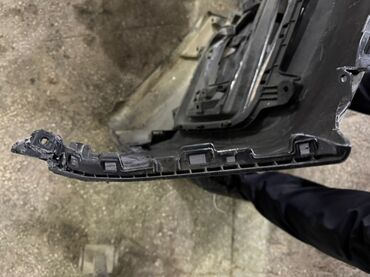 - Комплектация по фото: лицевая часть бампера, центральная накладка/усилитель, крупноячеистая решётка под эмблему. Крепления и посадочные места показаны крупным планом.
